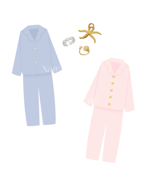1x Lumière de Mer Pajama Set (long-sleeved, pastel blue with starry silver shell and star buttons)