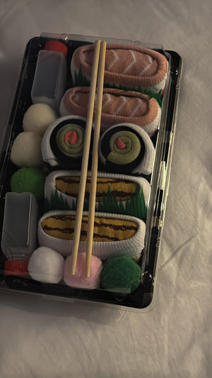 A cozy sushi snack for your feet! This adorable set includes three playful crew socks styled like your favorite sushi rolls salmon, maki, and tamago all neatly packed in a sleek, clear top tray.
